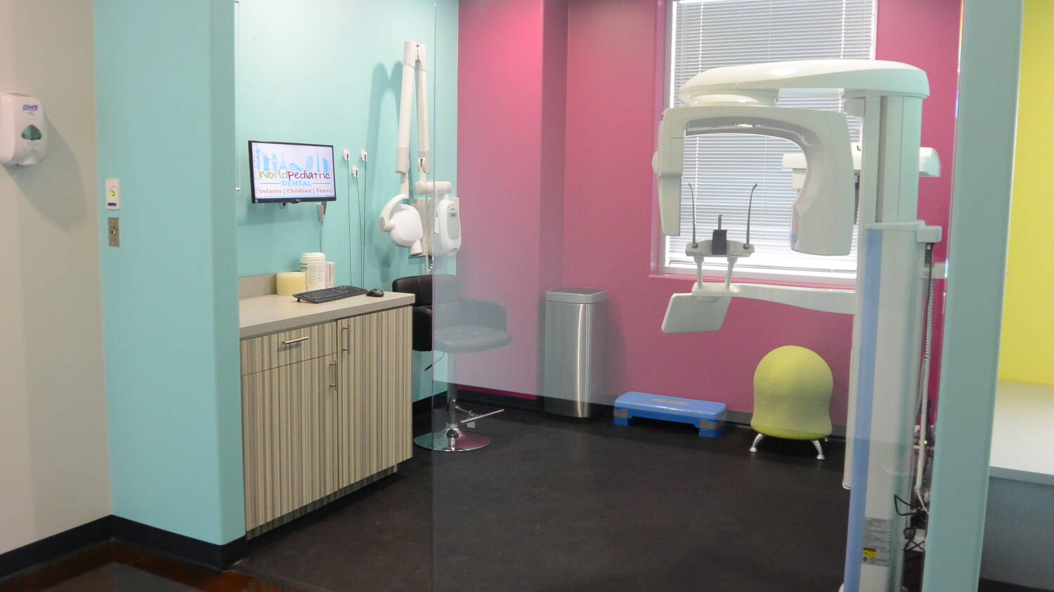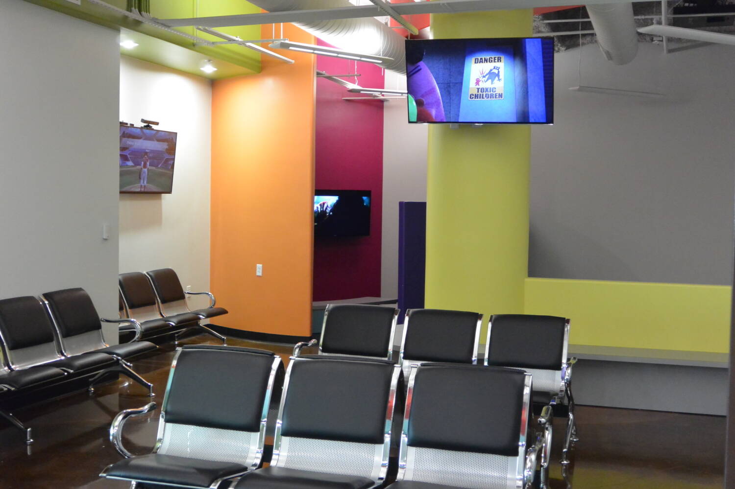 The bright colors provide a very pleasant atmosphere and helps to relax your child as soon as they walk through the door. A big screen television on the main pillar for both parents and kids to watch movies on while they wait to be seen. What’s that in left corner? I’m glad you  asked!